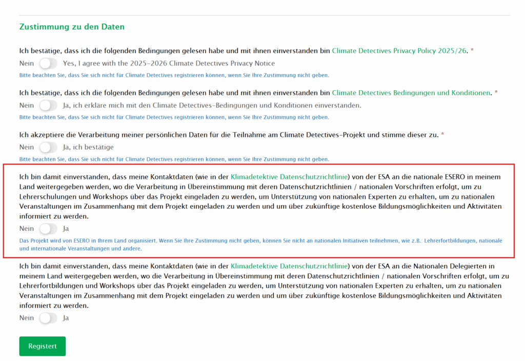 Wichtiger Hinweis zur Anmeldung: bitte stimmen Sie bei folgendem Punkt zu, damit wir Ihre Kontaktdaten bekommen, und Sie zu den Expert*innen-Talks, Feedbackrunden, Climate Detectives Summit, usw. einladen können!